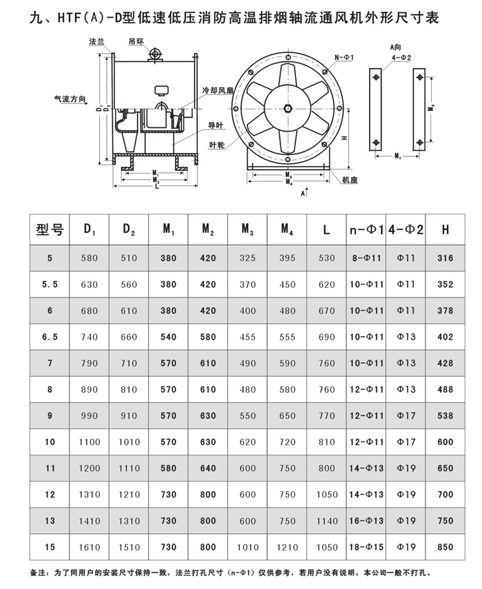一.HTF(A)系列消防高温排烟轴流通风机概述、特点1. HTF(A)系列消防高温排烟轴流通风机,其基本形式为轴流式结构,采用耐高温电机,配有专门的电机冷却系统。具有性能优良、耐高温性能良好、效率高、占地比离心风机少、安装方便等特点。2. HTF(A)系列消防高温排烟轴流通风机经“国家消防装备质量监督检验中心”检测合格,其性能达到国内领先水平,经全国三十多个省市的消防部门认可。该风机畅销北京、天津、上海、重庆、浙江、广东、江苏、山东、河南、河北、安徽、湖南、四川、辽宁、湖北、陕西、吉林、内蒙古、山西、贵州、黑龙江、福建、江西、云南、深圳等全国各省(市)、自治区。3. 耐高温性能优良:风机测试符合GBJ45-82消防规范标准要求,风机采用独特设计,耐高温电机内置,配置电机冷却系统,能在300℃高温下连续运行100分钟以上、100℃温度条件下连续20小时/次不损坏,广泛应用于高级民用建筑、烘箱、地下车库、隧道等场合;4. 适用范围广:可以根据高级民用建筑的不同要求,采用变速或多速驱动形式,以达到一机两用(即常用通排风和消防时高温排烟)的目的;叶型分为轴流式(HTF(A)-Ⅰ、Ⅱ)和混流式HTF(A)-IG,亦可制作屋顶式、消音式。5. 效率高:本系列风机采用先进的CAD软件经多目标优化设计研制开发的新产品,经实测表明风机效率大于80%,部分大机号大于85%,并具有效率曲线平坦的特点,有利于节能;6. 安装方便,占地较离心风机少:该风机基本形式为轴流风机或混流式风机,可直接与风管连接或墙壁安装,安装形式可采用直式或水平式。很大程度上节省了占地面积。